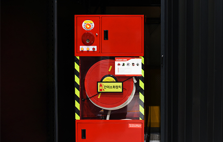 창고 내 곳곳 소화기, 화재 감지 시스템 및